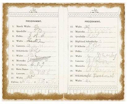 The pages inside the programme list dances for the evening, such as the polka, waltz, mazurka, and quadrille. Men would write their names next to the dance they would like to have with the woman holding the dance card.