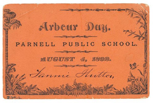 This illustrated Arbour Day ticket was handed to those attending a tree-planting event hosted at Parnell Public School, Auckland, 1892.